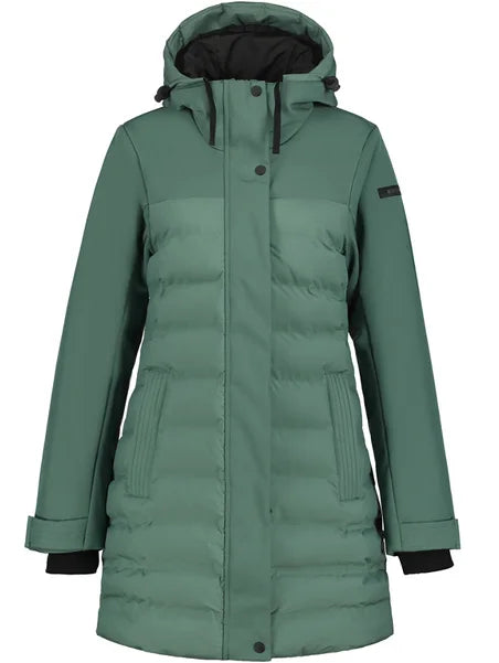 Icepeak Jacke in Daunenoptik für Damen. Verstellbare feste Kapuze. Elastische innere Ärmelbündchen. Zwei Reißverschlusstaschen vorne. Reißverschluss vorne. Logo-Label. Nahtlose Steppung. Wassersäule 8 000 mm. Atmungsaktivität 3 000 g\m2\24h. PFC-freie Imprägnierung. Funktionalität und Komfort wurde besondere Beachtung beim Design-Prozess dieses A.W.S. ACTIVE-Produkts geschenkt, weswegen es für intensive wie auch für entspannte Aktivitäten geeignet ist. Softshell ist ein funktionales Material für vielfältige Outdoor-Aktivitäten. Das Produkt bietet Wetterschutz, ist aber gleichzeitig angenehm elastisch. Die Wattierung besteht aus Daunenimitat, das eine exzellente Wärmeisolierung im Verhältnis zu seinem geringen Gewicht bietet. Die Gewebeoberfläche ist wasserabweisend imprägniert. Das winddichte Material bietet optimalen Windschutz und Wärme. Warm gefüttert.